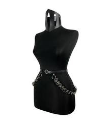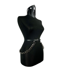 This black leather belt features a thin waist band that sits comfortably on the hips and two chains that dangle from either side, adding an edgy touch to your outfit. The chains are carefully crafted to complement the sleek design of the belt, making it a perfect accessory for those who want to make a statement. Whether worn with jeans, skirts, or over a dress, this belt is sure to turn heads and elevate any look.